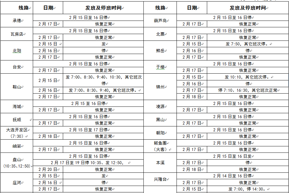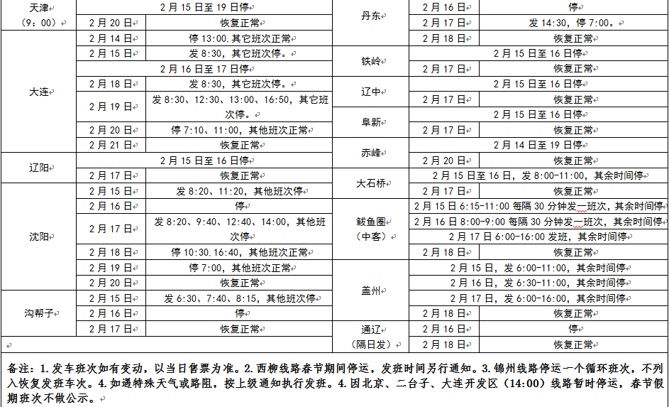 營口交通運輸集團汽車客運站有限公司2018年春節(jié)假期班次安排表